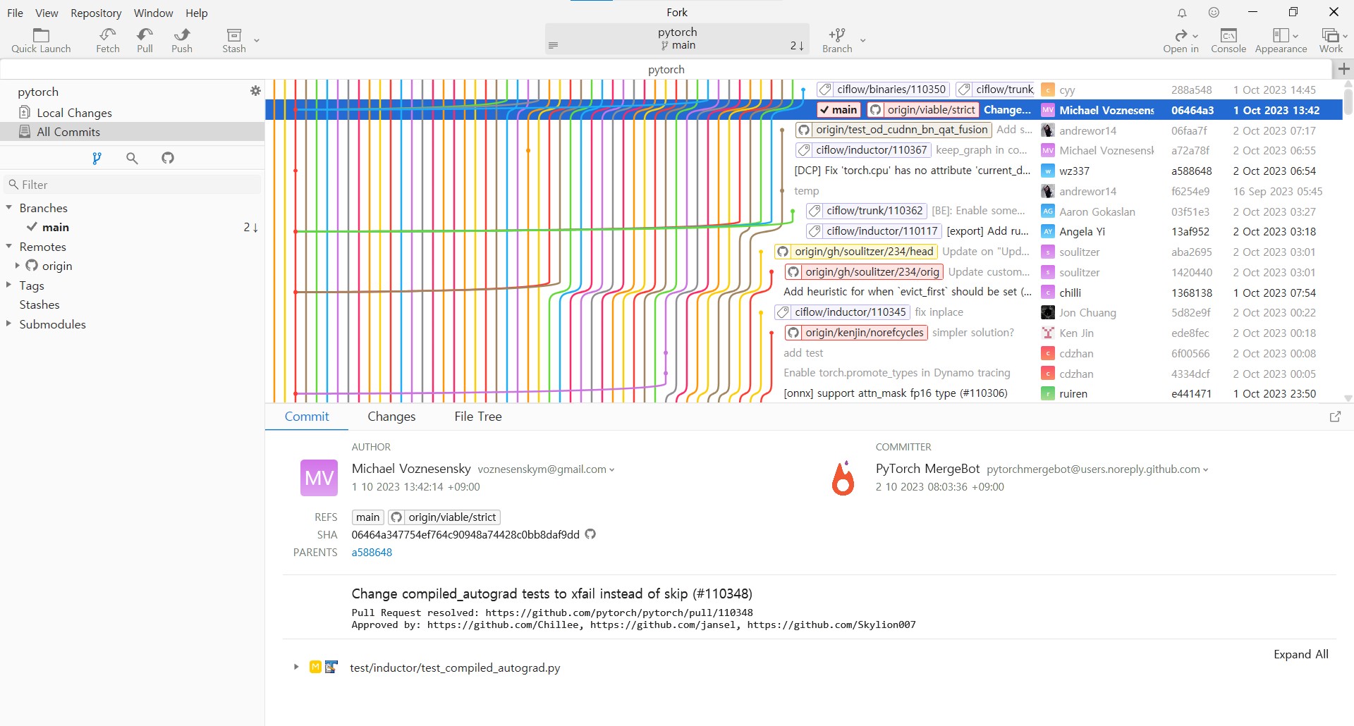 ③ 클론이 완성된 직후의 모습이다. 링크의 원격 저장소가 복제된 모습이다. 그리고 pytorch 원격저장소를 보면 commit들이 쌓인 것을 볼 수 있다.