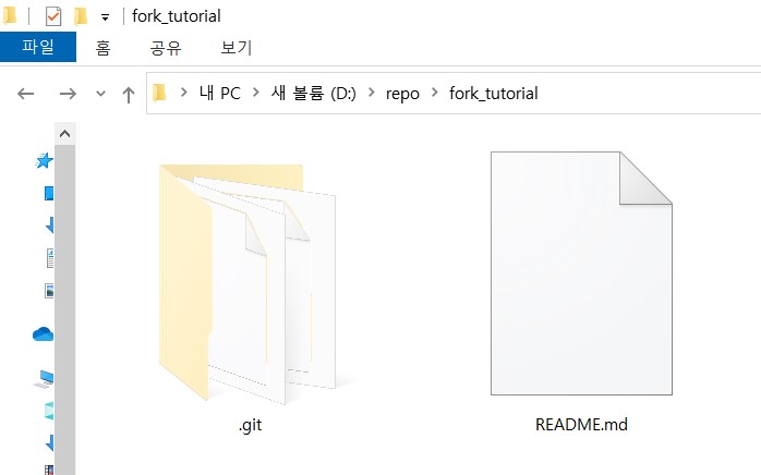 ④ 클론된 위치를 보면 D:\repo\fork_tutorial에 되어 있는 걸 알 수 있다. 이때 .git폴더가 있다는 것을 확인할 수 있다. 원격저장소를 클론하면 원격 저장소의 .git 폴더까지 복사된다.