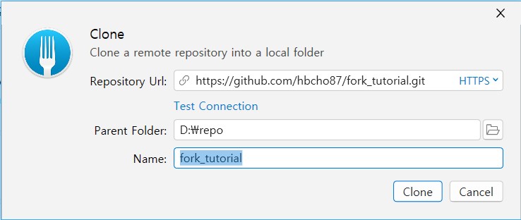 Parent Folder는 사용자가 원하는 경로에 넣으면 된다. 필자는 D드라이브의 repo 폴더로 설정했다. Name은 복사한 원격 저장소 이름을 나타낸다. 참고로 Frok client는 복사한 HTTPS주소에 맞춰 Repository Url과 Name은 자동으로 기입해서 편리하다.