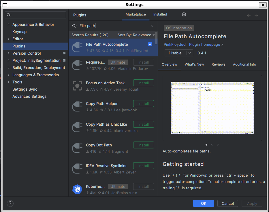 아래와 같이 Plugins에서 File path autocomplete를 검색하고 install 하면 된다.